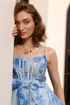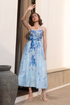 Slip into serenity with the Azure Garden Midi Dress, a breezy silhouette kissed with hand-painted floral charm. This dreamy blue number is crafted to flatter with its corset-style bodice and soft pleated flare that dances with every breeze. Perfect for your go-to elegance with a splash of whimsy.