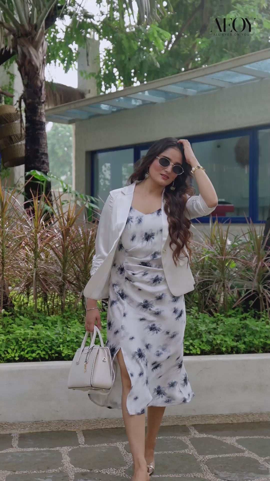 Turn heads in this elegant Grey Satin Slit Dress With Blazer set featuring a fitted camisole dress and a luxe silk-finish blazer. Perfect for office parties, formal brunches, and evening affairs, this printed satin dress with blazer is your go-to for effortless sophistication. The soft shimmer adds a festive glow while the midi length keeps it classy. Style it as a wedding guest outfit, a cocktail dinner look, or a stylish business event ensemble — it does it all.