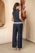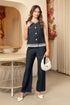 Turn heads with this structured sleeveless Dark blue denim coord set, featuring a statement lace hem, silver buttons, and contrast white stitch detailing for a crisp finish. The tailored trousers flatter all silhouettes, while the versatile vest top brings a vintage twist to modern fashion. Whether you're heading to a coffee date, brunch meeting, or evening stroll, this piece blends comfort and polish.