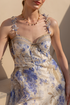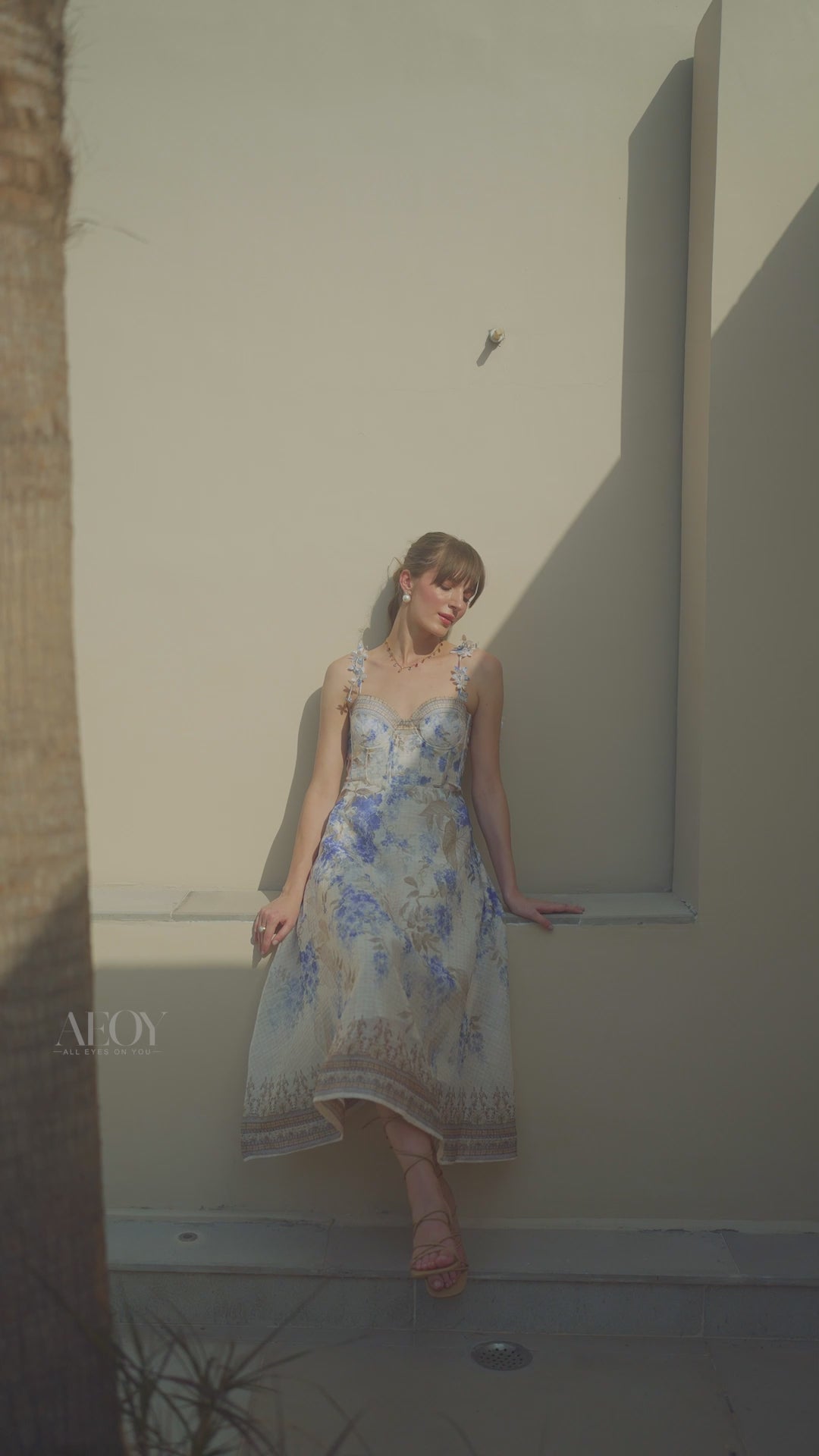 Step into a dreamscape with the Iris Charm-Midi Dress, a timeless fusion of structure and softness. Adorned with delicate blue florals and heritage border detailing. Perfect for destination weddings, intimate garden brunches, or a dreamy vacation look—this piece is a blend of vintage vibes and modern grace.