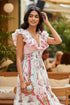 Step into dreamy elegance with the Pink Print Ruffle Maxi Dress- a timeless, feminine silhouette designed for effortless daytime charm. Featuring soft ruffle shoulders, a flattering V-neckline, and delicate all-over prints, this maxi dress blends comfort with elevated style. Crafted for women who love light, airy, and flowy dressing, it’s the perfect choice for brunch outings, vacation wear, resort looks, and daytime celebrations.