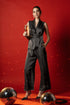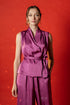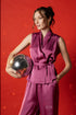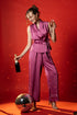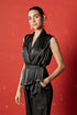 Unleash effortless elegance in this sleeveless co-ord party set — a luxe satin-textured ensemble in black and rich berry tones. The tailored wrap-style top with a flattering waist tie and flowy trousers is your answer to a non-dress party outfit that still turns heads. Perfect for cocktail parties, evening dinners, and New Year toasts — this chic partywear coord is where confidence meets glam.