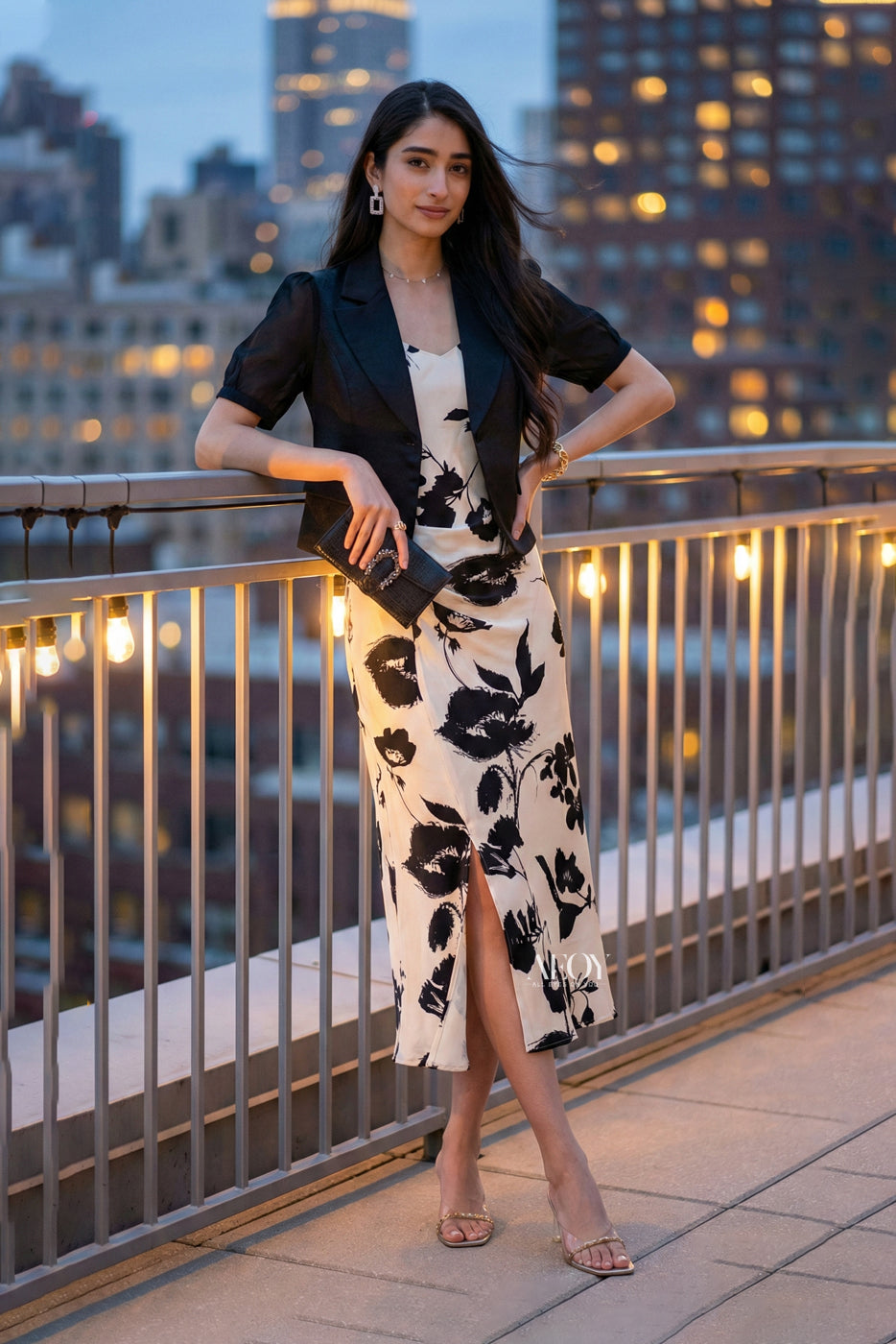 Step into your power with the White Satin Slit Dress With Blazer – a statement-making partywear set that blends elegance with edge. Featuring a luxe floral satin slip dress with a thigh-high slit and a sheer blazer, this outfit is perfect for cocktail nights, formal dinners, and after-dark glam. The monochrome palette adds timeless appeal, while the bold print keeps all eyes on you.